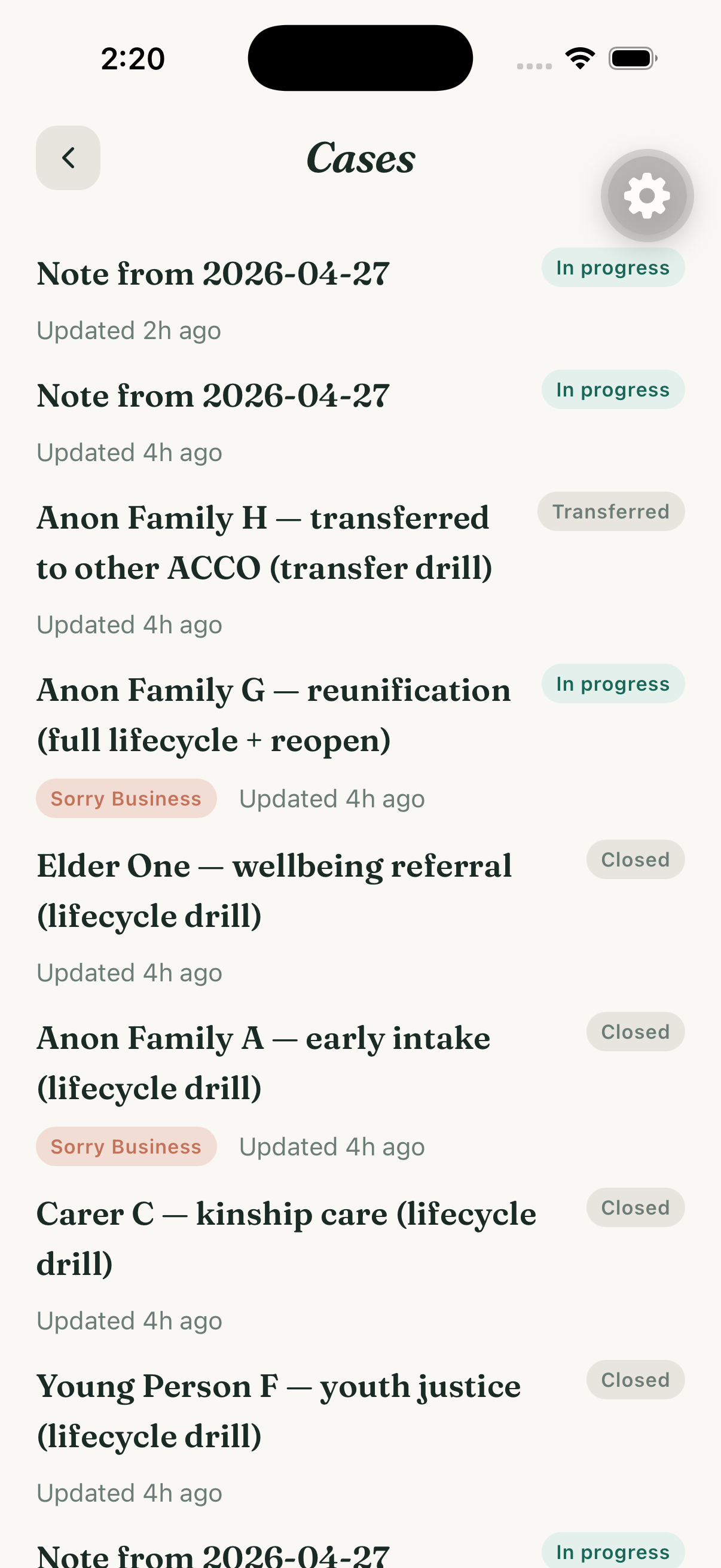 Cultural safety is the default, not an option. Kinship-aware attendees, SEWB framework prompts, ACPP-aware case attributes, Sorry Business mode, CARE-principles-aligned data governance. ACCO partners are co-designers, not consultees. Copy review is ongoing with VACCHO and SEWB Elders before any new copy ships.